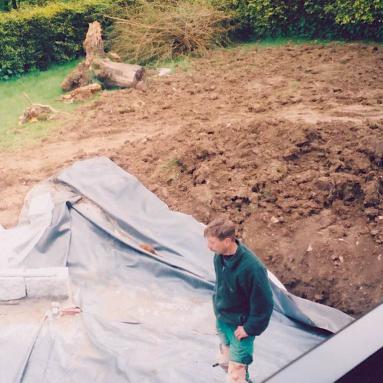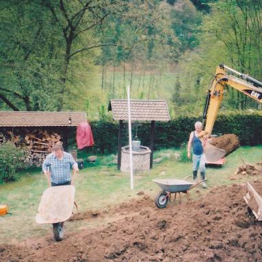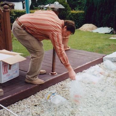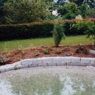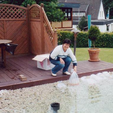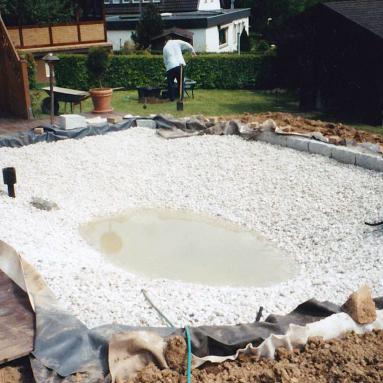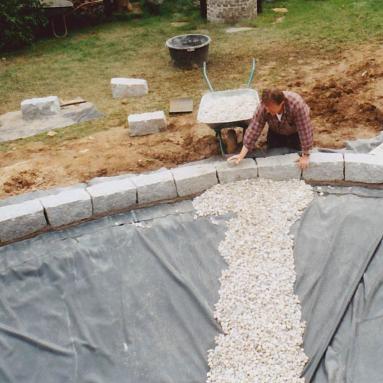 Teich: Vlies, Teichfolie, Granit-Kies, Mauer aus Granit, Pumpe ,Kabel, Schlauch, Skimmer, Filter, Pflanzen, Wasser und Kois
