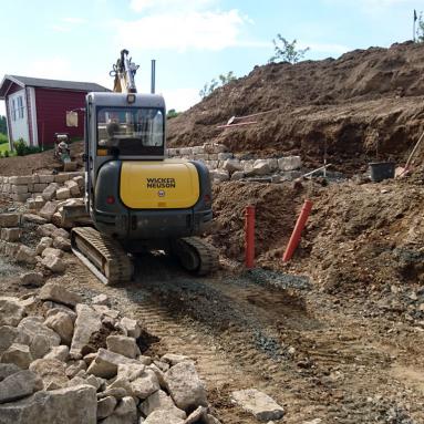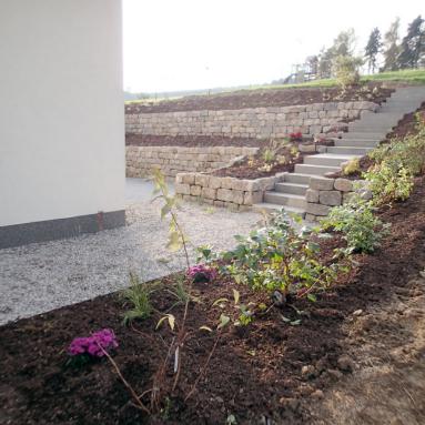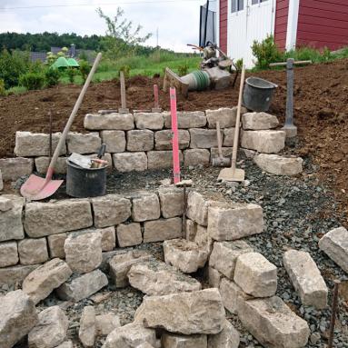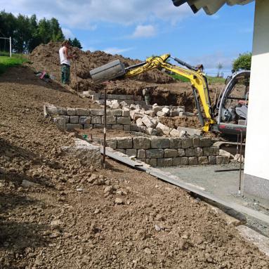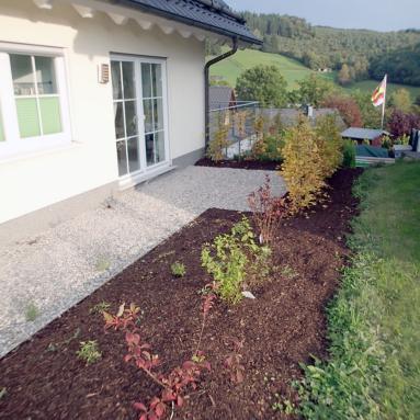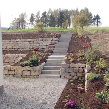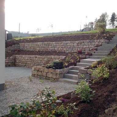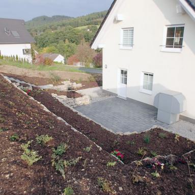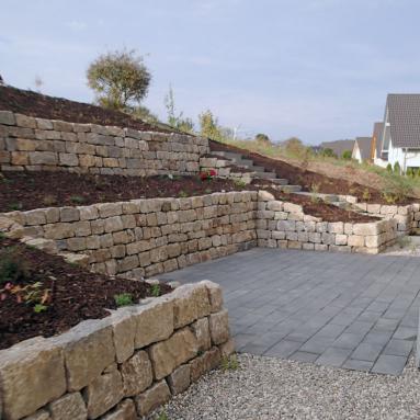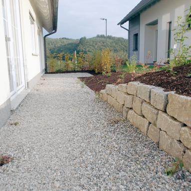 Material: Mauern Muschelkalk, Granitstufen, Pflaster MultiTec, Oberrheinkies 8/16 (auf Wabenplatten und in Teilbereichen mit Stauden bepflanzt), Oberboden, Stauden, Sträucher, Bodendecker und Rindenmulch